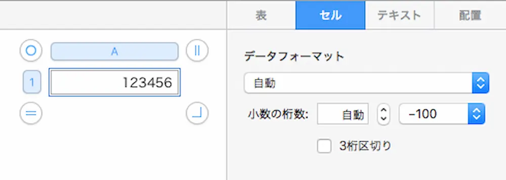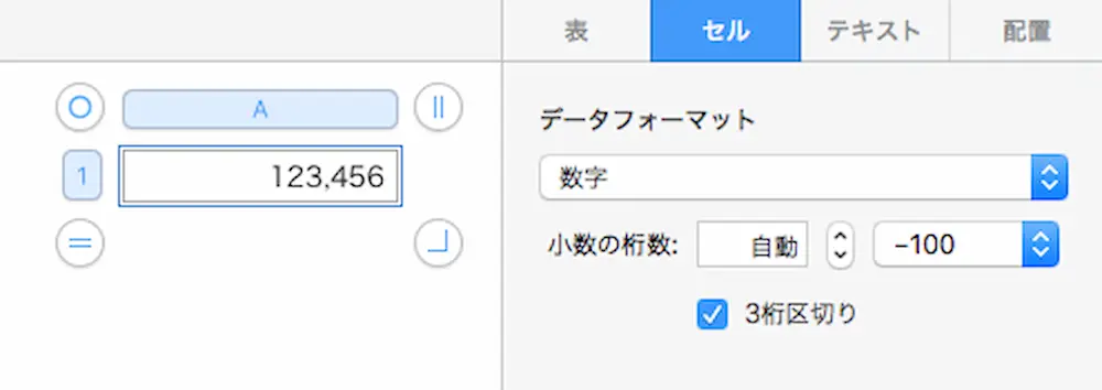 数字を3桁区切りにする場合は、「3桁区切り」の左側にあるボックスにチェックを入れます。