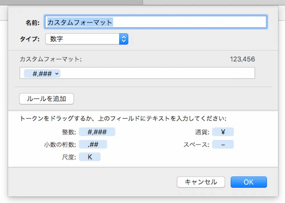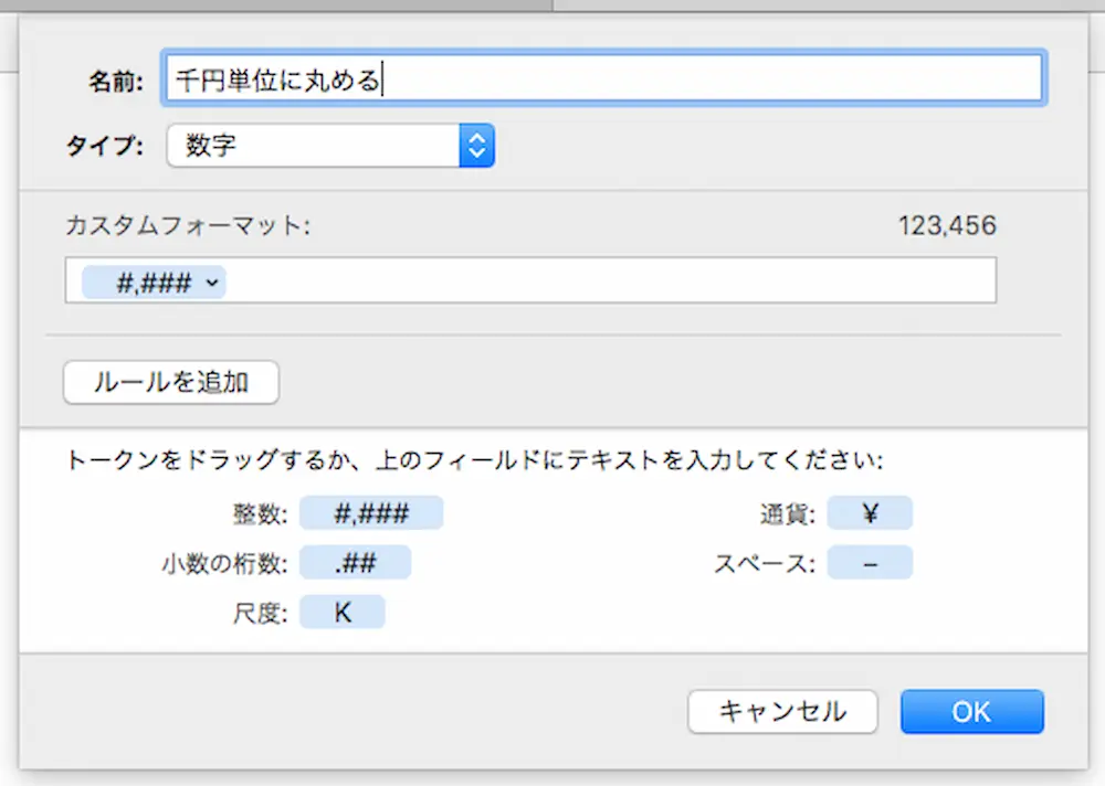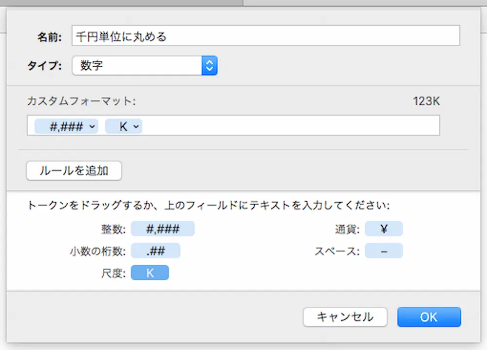 下のトークン欄から「尺度:K」というのをドラッグして、カスタムフォーマット欄に追加します。