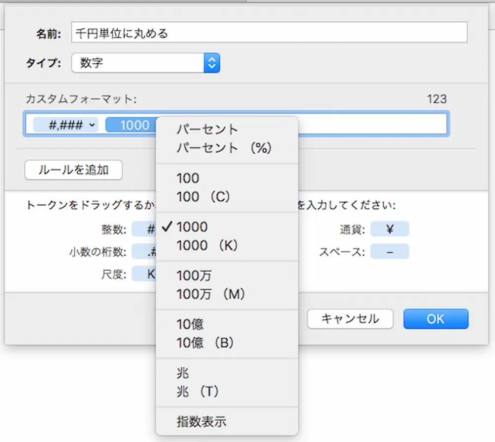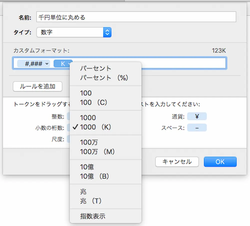 カスタムフォーマット欄の「K」の横の下向きの矢印をクリックすると、「1000(K)」となっているのでそれを、
